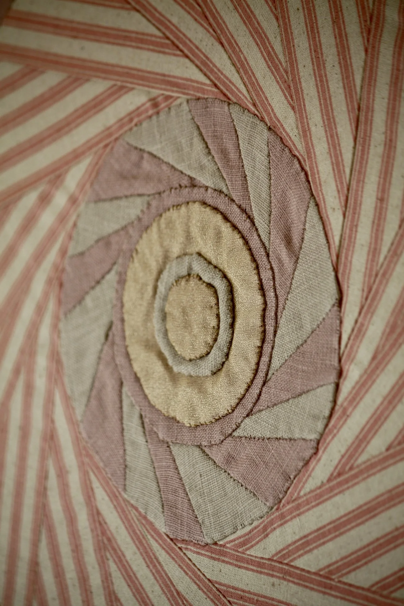 Labyrinth of Shoals. 2023 (Recycled textiles, beads, buttons, wool, silk and cotton thread, wool stuffing, embroidery hoop on linen backing). Approx. 39cm diameter