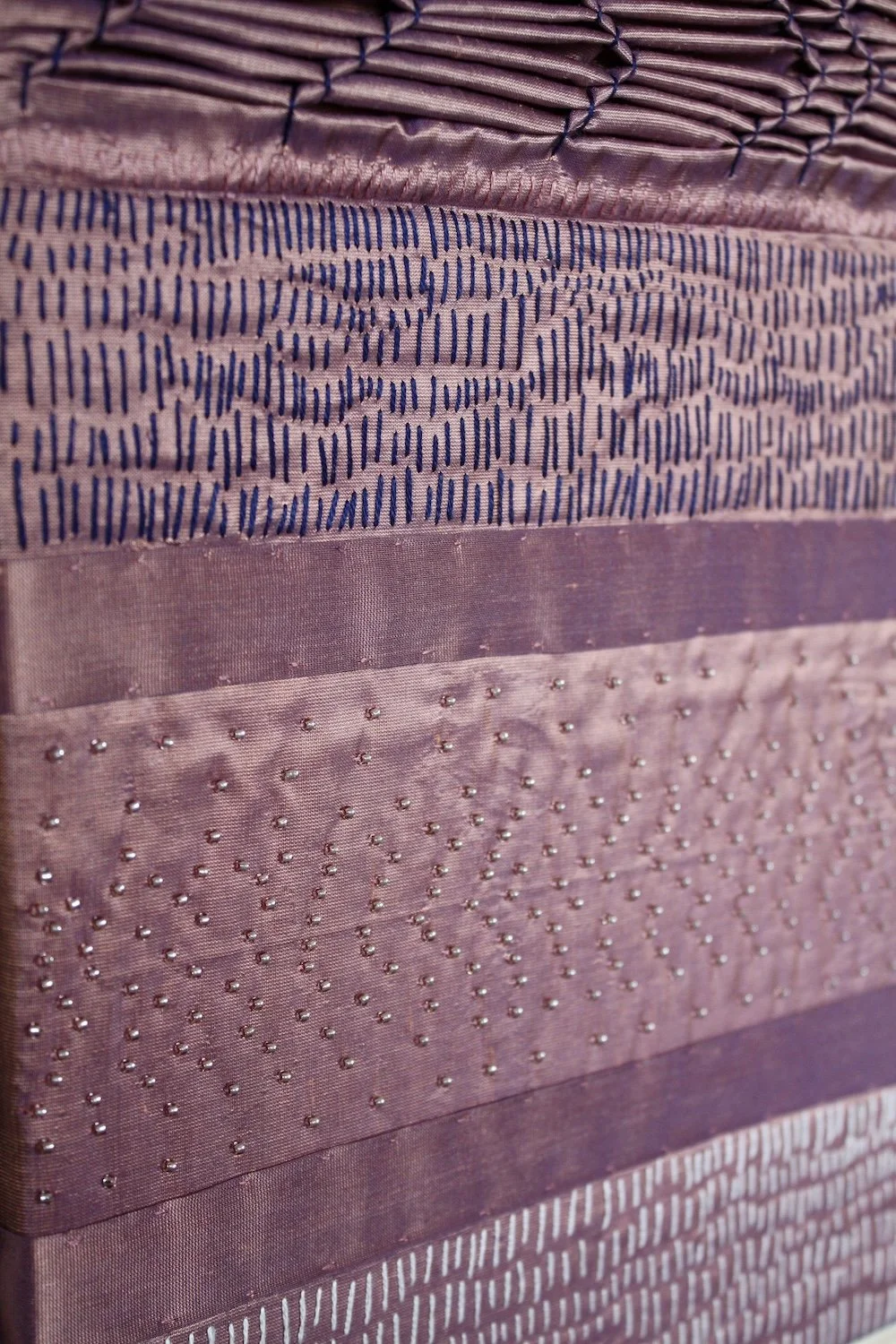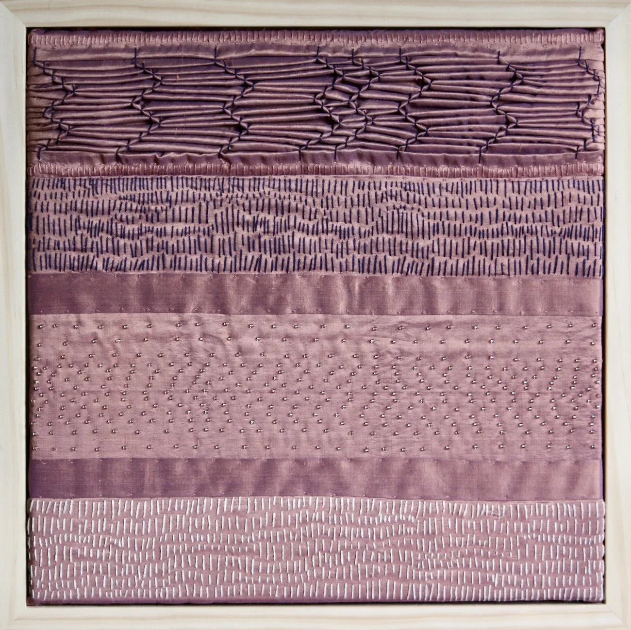 River Flow 2024 (Dupioni silk, Japanese seed beads, cotton and silk thread) Artwork 30 x 30cm (in wooden frame 34 x 34cm)