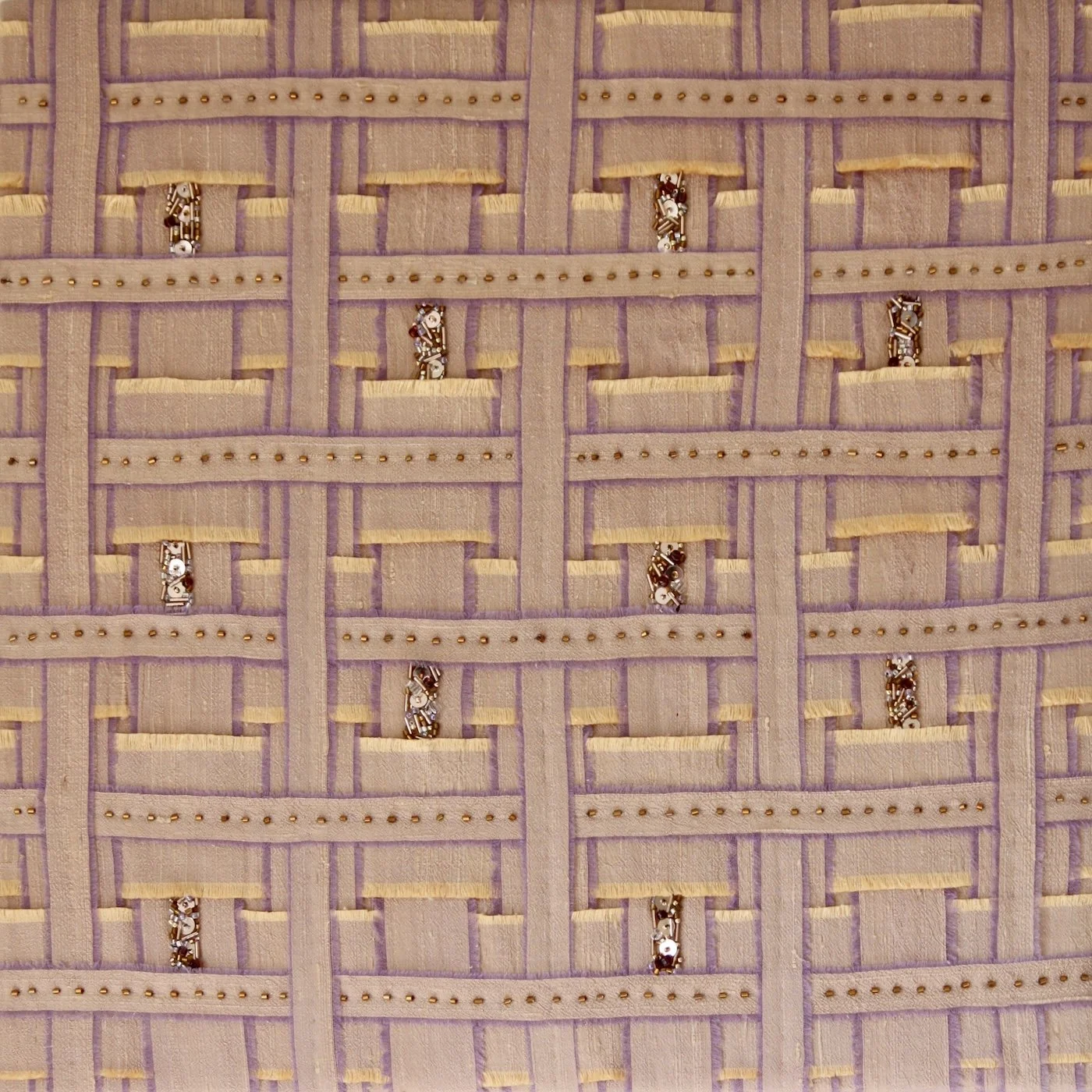 "What is seen and unseen" 2025 (Recycled linen, silk and synthetic fabrics, glass beads, silk thread) 40.6 x 40.6cm (in oak wood frame with Artglass 44 x 44cm)