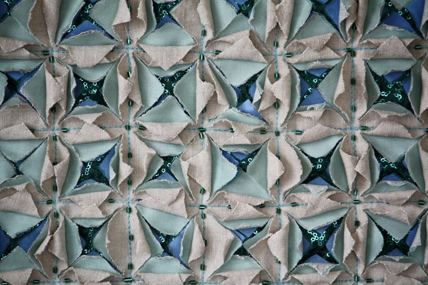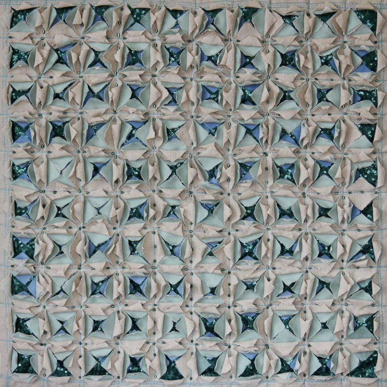 "Shifting Sands, Maroochy River" 2025 (Recycled silk fabric, glass beads, sequins) 40.6 x 40.6cm